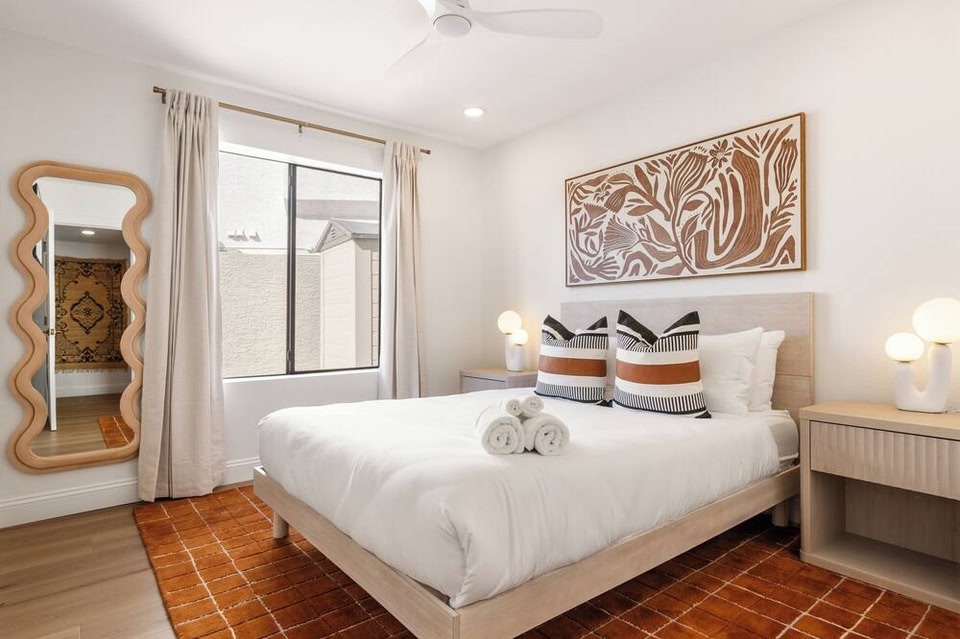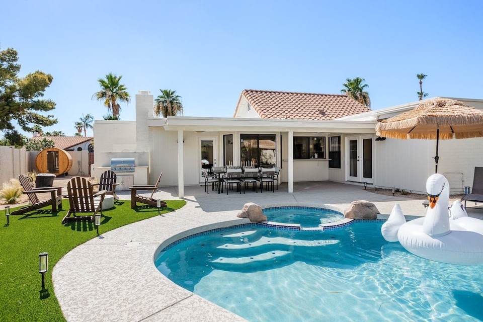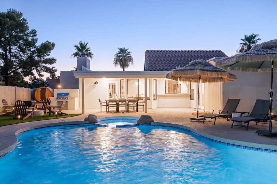 C’est dans le quartier Village de Paradise Valley à Scottsdale que vous trouverez ce cottage. Vous êtes un voyageur avide de culture ? Dirigez-vous vers l'emblématique Desert Ridge Marketplace (centre commercial). Vous préférez partir en mission shopping ? Les tout aussi sympathiques Kierland Commons (centre commercial) et Scottsdale Fashion Square vous attendent ! Consultez l'affiche de l'emblématique Westworld of Scottsdale et prévoyez du temps pour passer par l'agréable Phoenix Zoo, attraction prisée des environs. Avis aux amateurs de sport ! Les points d'eau de la région vous offrent le décor idéal pour vous essayer à des activités telles que le rafting, tandis que son écrin de nature est parfait pour tester la randonnée à pied ou à vélo et l'alpinisme. Avec ses nombreuses activités à proximité (rafting, alpinisme et bien plus encore), ce cottage qui accepte les animaux de compagnie a décidément tout pour vous plaire. L'hébergement dispose d'un parking à proximité, de là vous pourrez aisément faire le trajet de 5 minutes jusqu'à Kierland Commons (centre commercial) ou de 8 minutes jusqu'à Desert Ridge Marketplace (centre commercial). Ce cottage vous invite à buller au grand air avec un barbecue et une piscine extérieure. Une fois rentré de vos explorations, profitez des joies de l'intérieur (télévision, par exemple). Cette location avec 5 chambres et 4 salles de bain compte également un salon, un coin salle à manger, l'air conditionné et un service de conciergerie. Dans la cuisine, vous trouverez un four, une plaque de cuisson et un réfrigérateur, mais aussi un micro-ondes et des ustensiles de cuisine. Et vous pourrez voyager léger, car vous aurez accès à un sèche-linge.